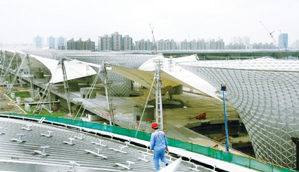 安裝在“陽光谷”頂部的索膜結(jié)構(gòu)由69塊巨大的白色膜布拼裝組成,形如藍天下的朵朵